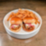 Two Angus beef sliders, cheddar cheese, lettuce, tomato, aioli, secret sauce, caramelized onions, sweet rolls with beer-battered fries.