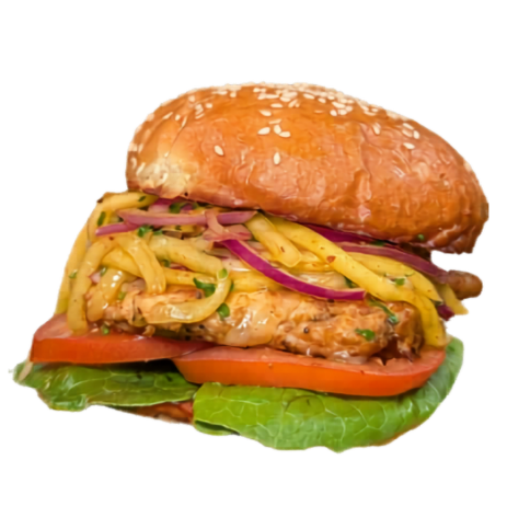 Grilled chicken breast layered with Swiss cheese, garlic aioli, fresh lettuce, tomato, and sweet & spicy cajun mango pico on a toasted bun. Served with fries and fried pickles